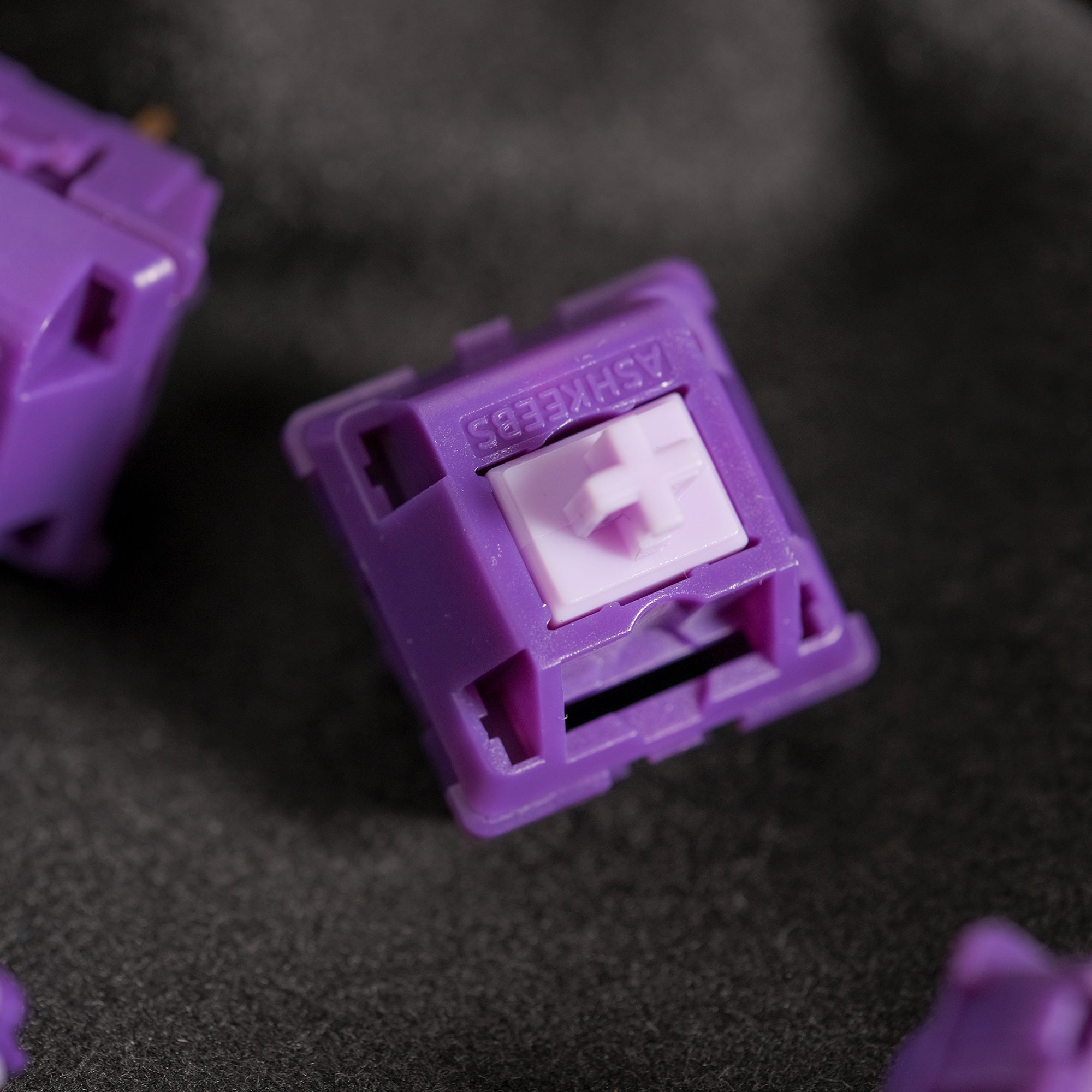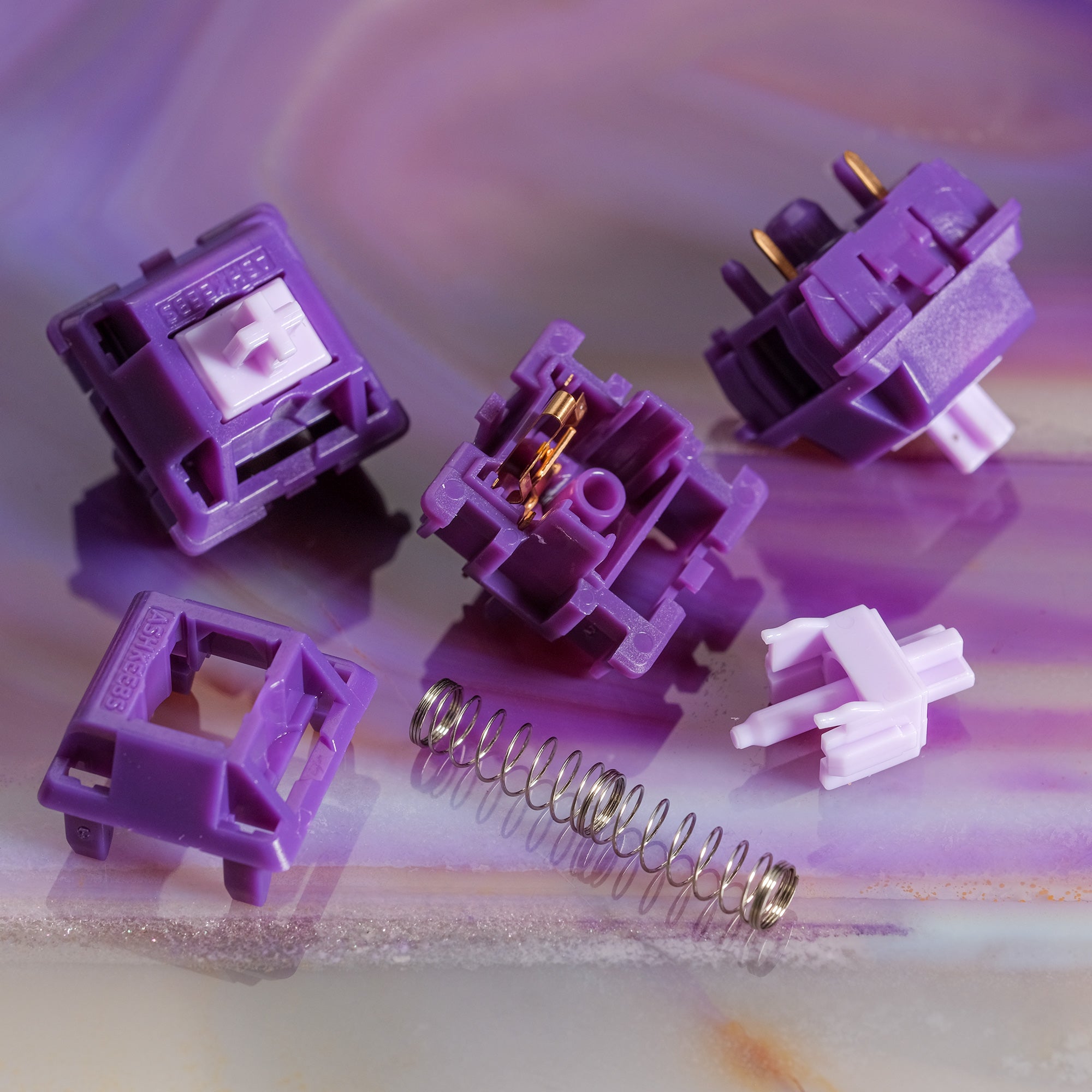 The Amethyst switches are the tactile member of the latest switch collection from Ashkeebs. They feature a bold purple body with a light pink stem that comes together to create an aesthetic pleasing switch. The double-extension spring allows for a snappy stem return and create an even feeling during compression!