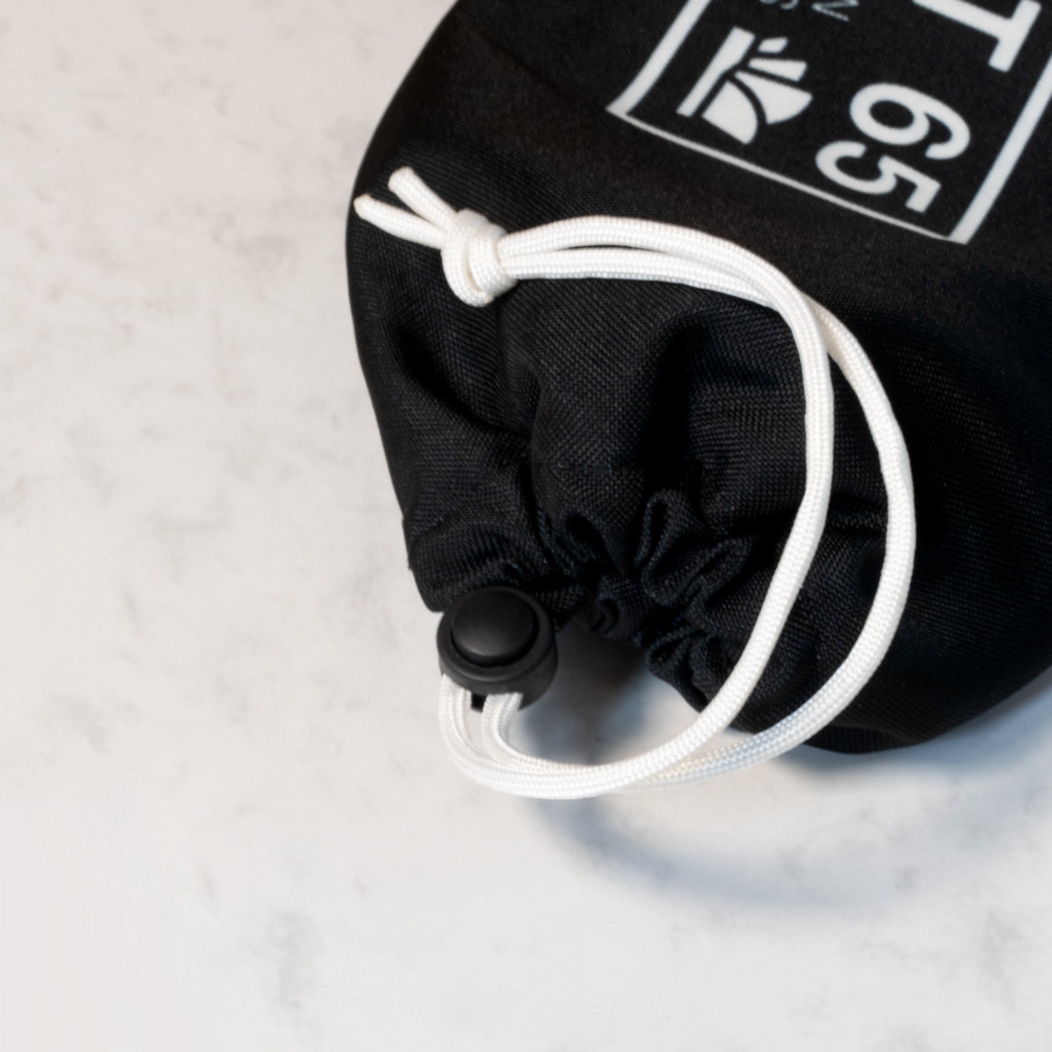 White drawstring with black cord lock